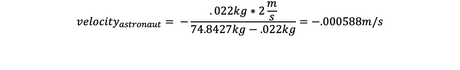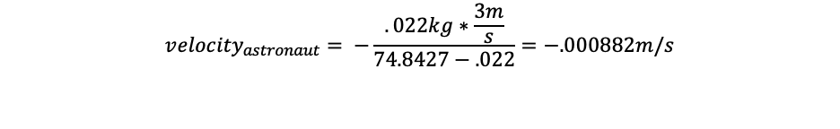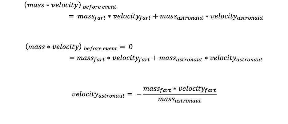 There is a bit of a complexity in that we will have to be careful to keep track of the mass of the fart. For this humorous example, the numbers from a quick internet search are likely to be good enough. If a typical astronaut weighs 165 lbs, that is equivalent to 74.8427 kilograms (I use SI units because it is harder for me to mess up the units). While 74.8427 may seem like an unnecessarily precise number, the astronaut is so big relative to the size of a fart that it is important to wait until the end to round. Based on a quick internet search, a typical fart can be estimated to have a mass of 22 grams or .022 kilograms. Similarly, the internet gives values of 2-3 meters per second for the velocity of a fart. Based on some quick algrebra, we can rearrange our equation to find the term we want: